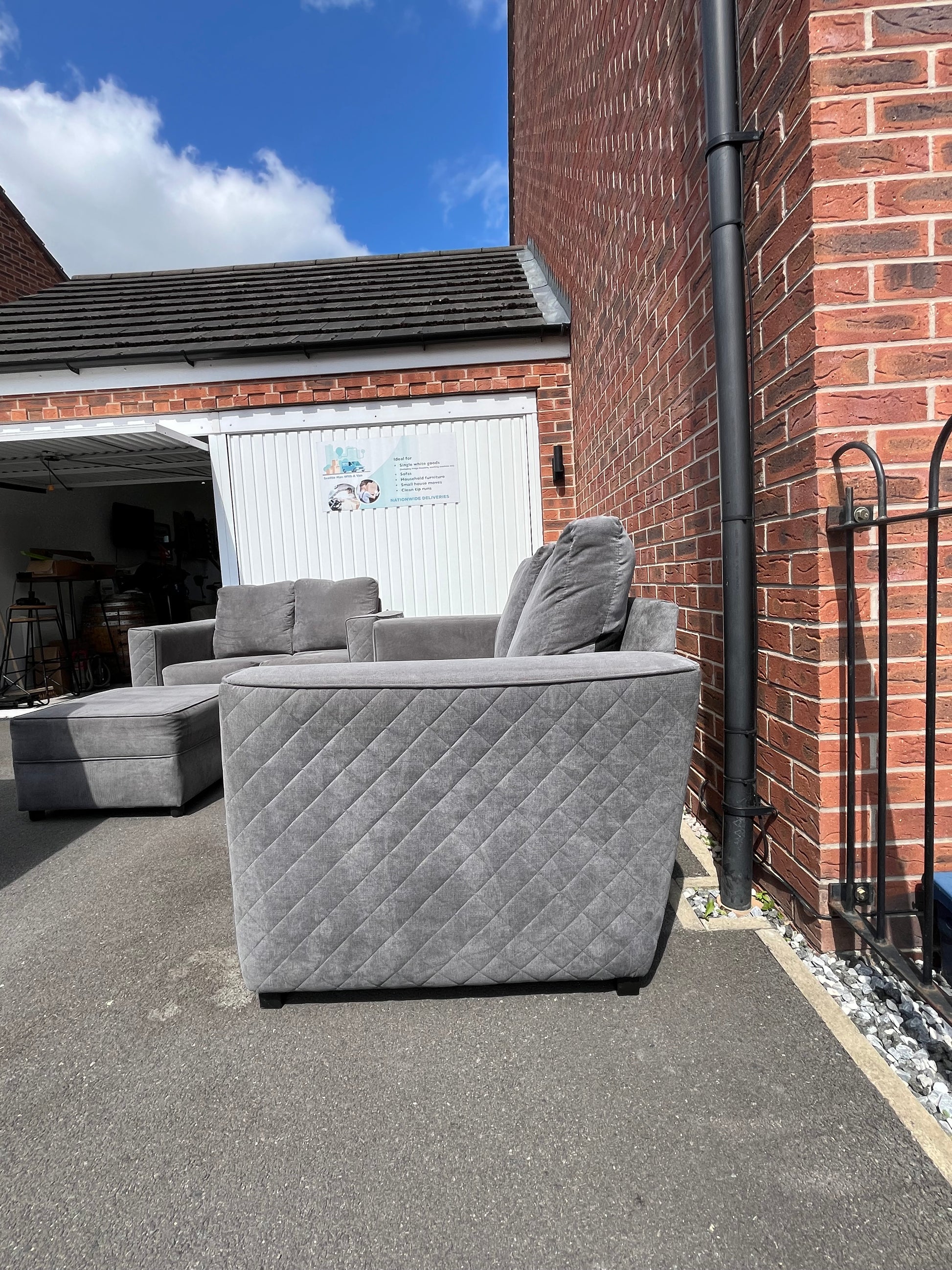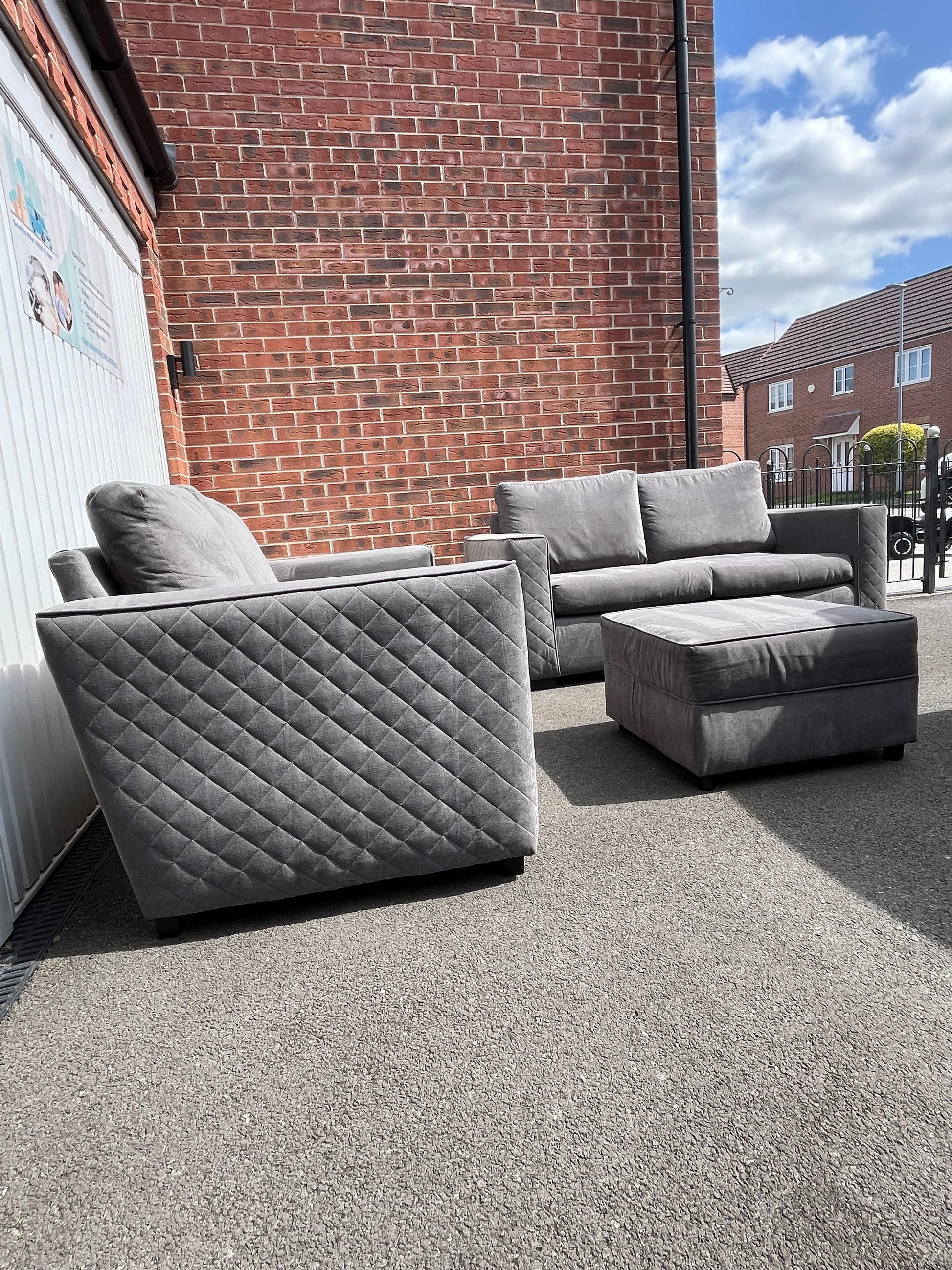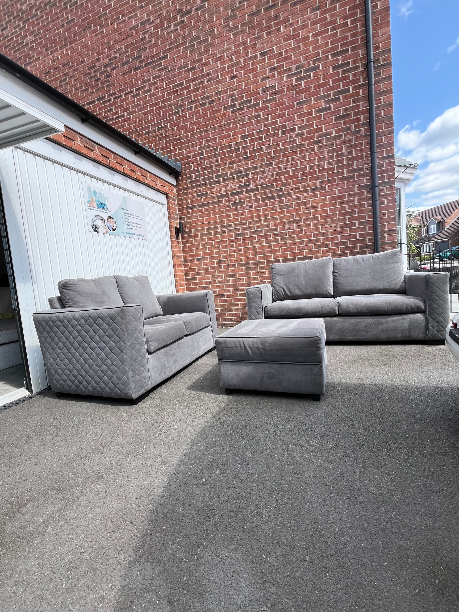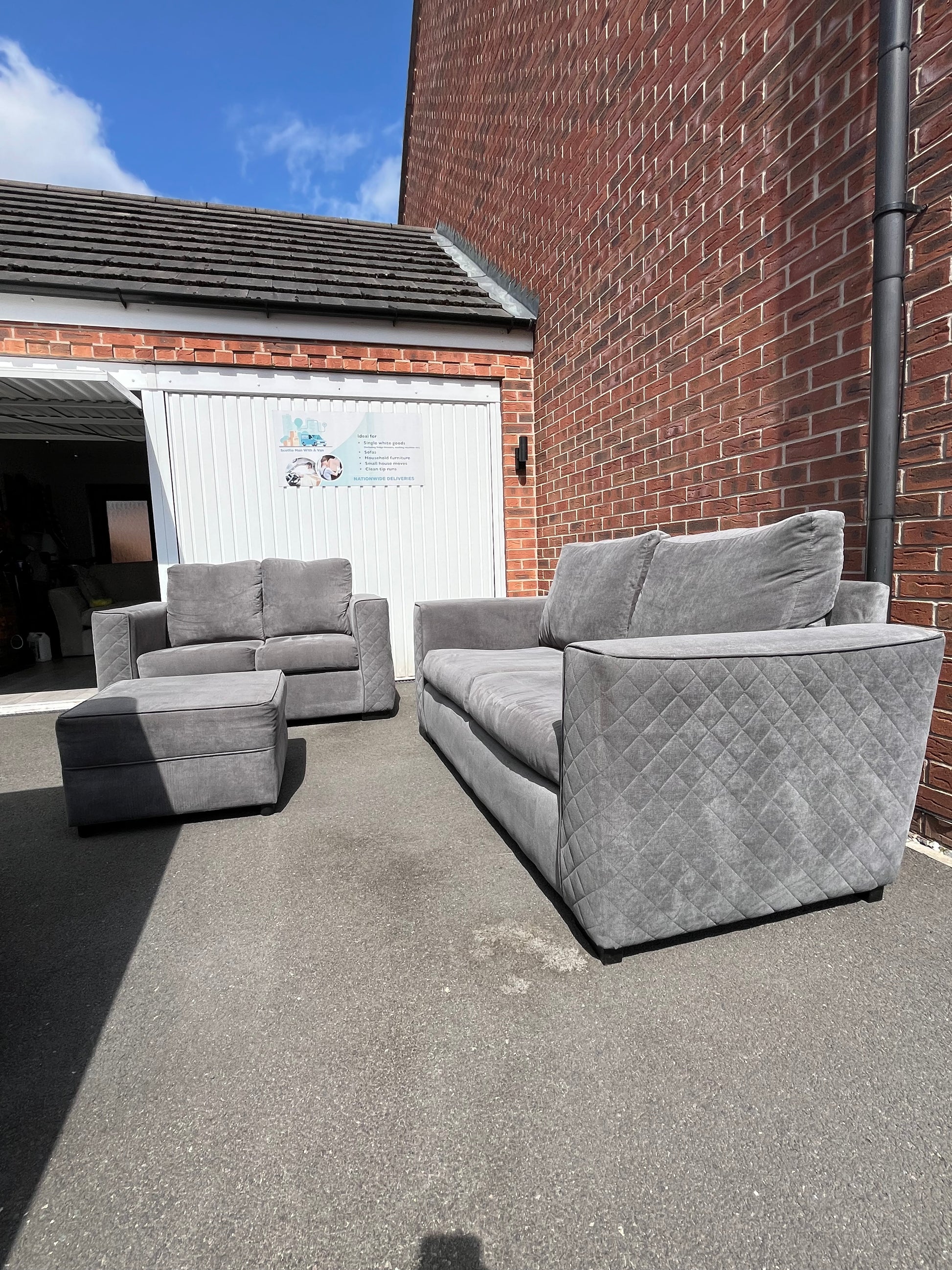 3+2 seater grey sofas with footstool , excellent condition, diamond pattern to arms, smoke and pet free home, washable cushions.