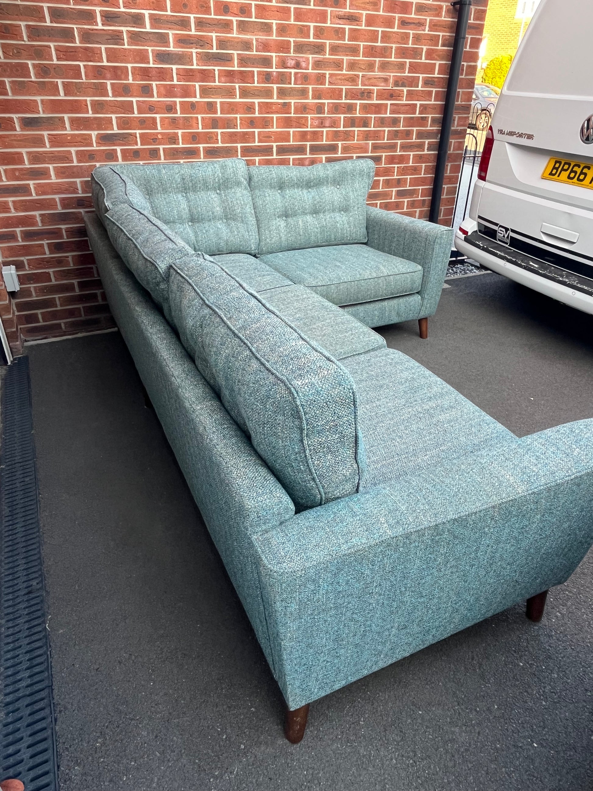 Westbridge corner sofa, teal weave fabric,wooden feet, lovely corner in excellent condition.